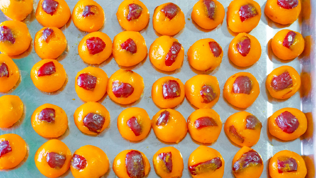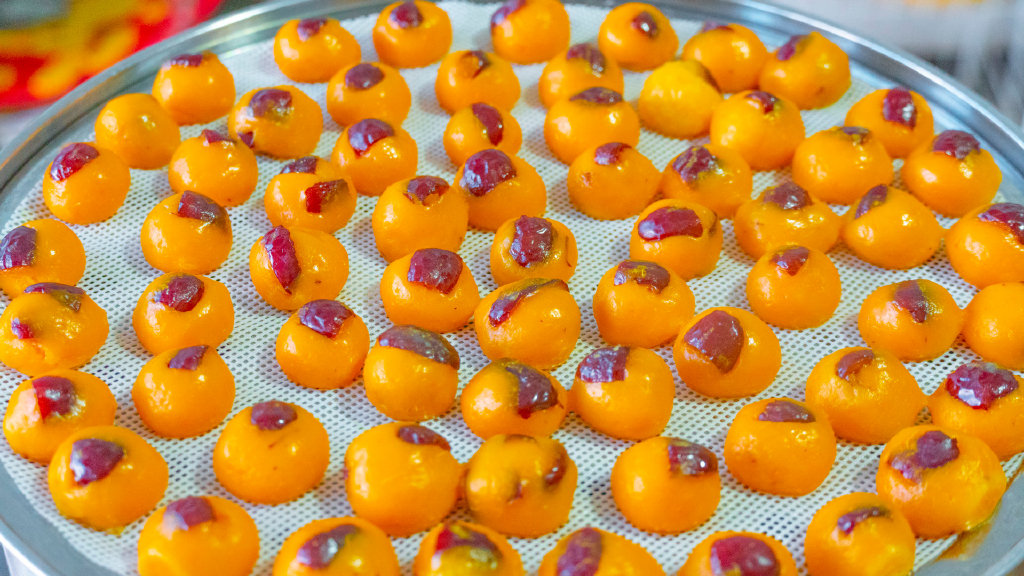 7、全部搓完了就可以上锅蒸了,蒸笼记得提前铺上不粘垫子,然后挨个把红薯小丸子放进来,每一个之间记得留点空隙,避免粘连在一起。