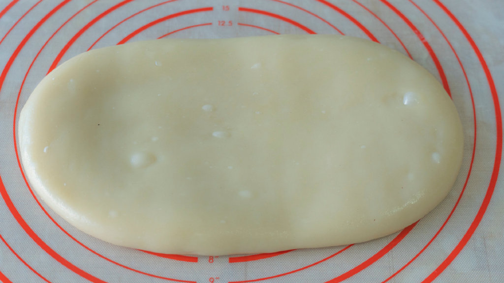 9、黄油融化后把糯米团儿移到砧板上,继续揉一揉,把糯米团揉匀揉光滑,揉好的糯米团是不粘的,先搓成长条,再稍微的压一下,最后再擀成一个长方形的面饼就可以了。