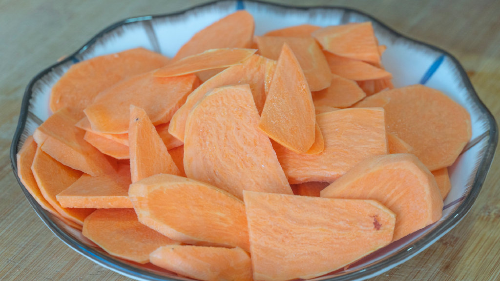 1、先准备2个红薯,洗净后先削皮,然后再切片,想要红薯更快的蒸熟,切片的时候尽量的切薄一点,这样蒸的时间会更短,切好后装入碗里。