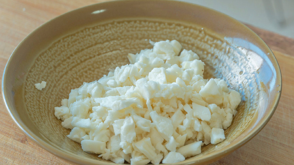 1、山药两根,洗净削皮,然后用刀拍碎,颗粒比较大的话再用刀剁一下,剁成这种小颗粒就行了,装入碗里。