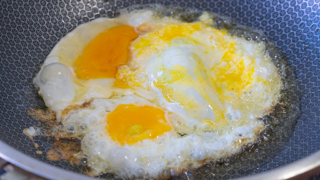 5、起锅倒油,打入3个鸡蛋,先煎一下,一面金黄后翻面,两面都煎得焦焦的后出锅。