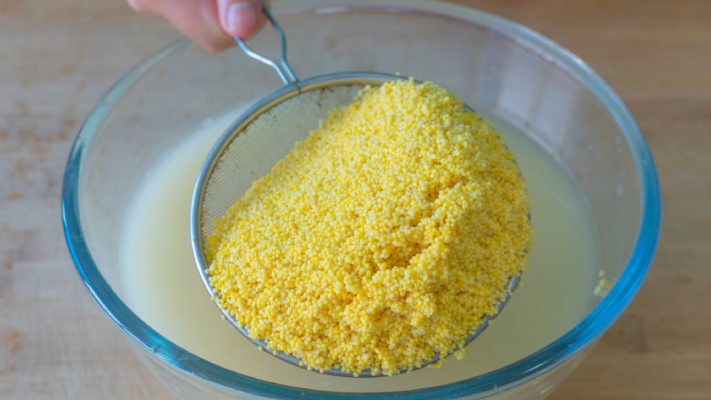 1、小米300克,加水提前泡一夜,节约时间也要3小时以上,小米泡好后也吸饱了水分,先倒出来沥干水分。