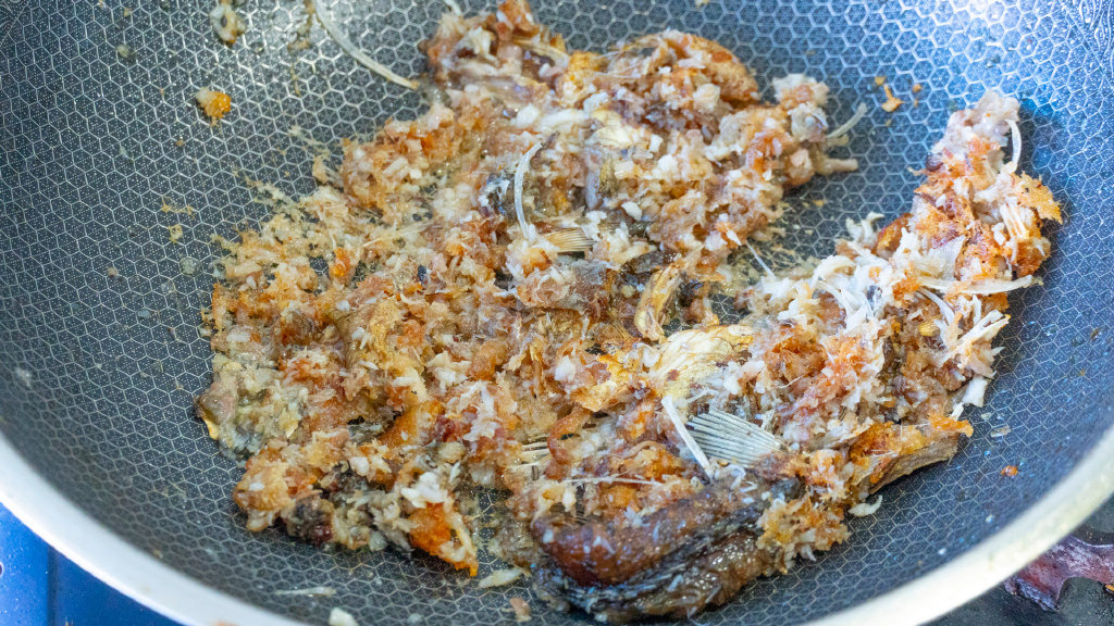 7、两面都煎的金黄后就可以了,这时候用锅铲把鱼捣碎,然后继续煎一煎,煎到鱼肉夜金黄焦脆。