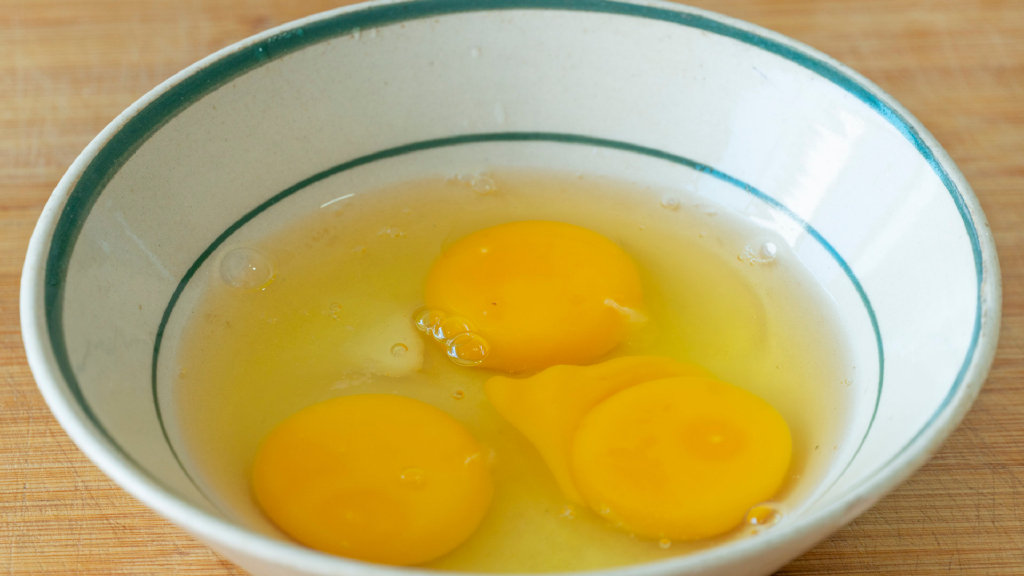 5、另准备一个碗,打入三个鸡蛋,加一勺盐后搅散。
