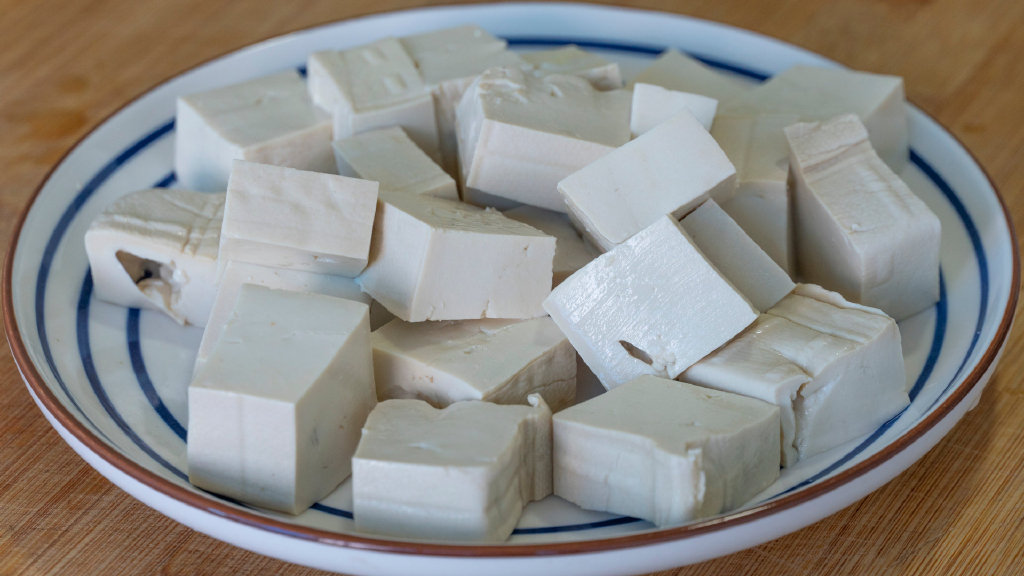 3、豆腐一块儿切小块备用,豆腐煮鱼汤是绝配。