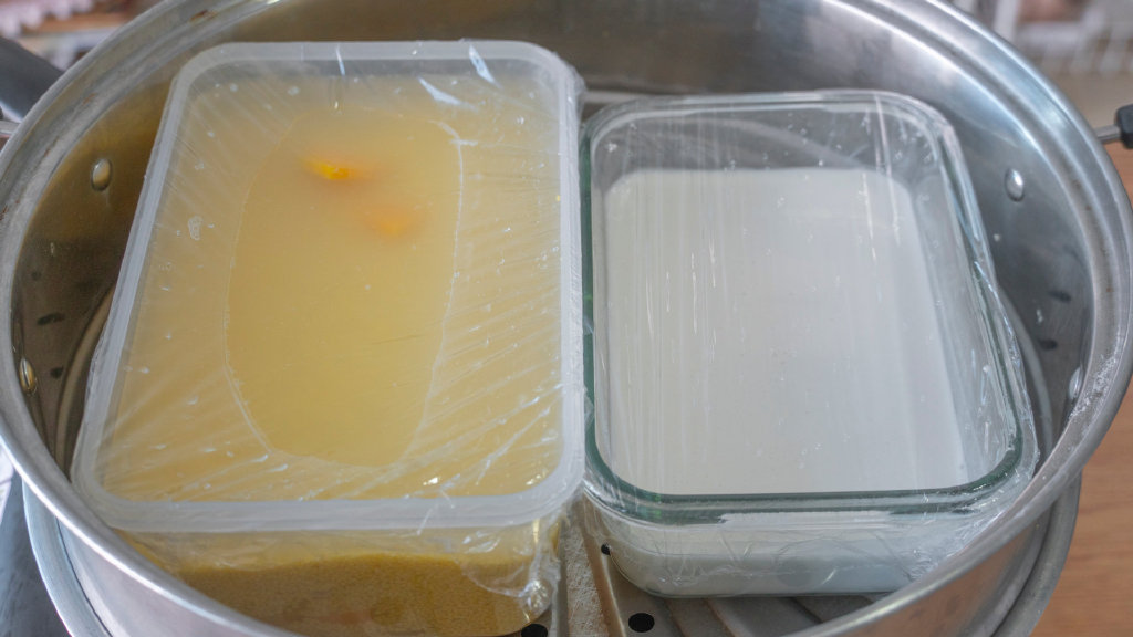 6、接着起锅烧水,把小米和糯米糊都一起放进去蒸,水开上汽后大火蒸40分钟。
