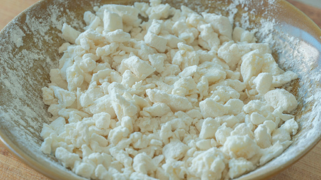 2、然后少量多次的加入面粉,边加边搅拌,直到搅拌成颗粒分明的小疙瘩,这个面疙瘩的做法简单又营养,口感还丰富,做好后先放一旁备用。
