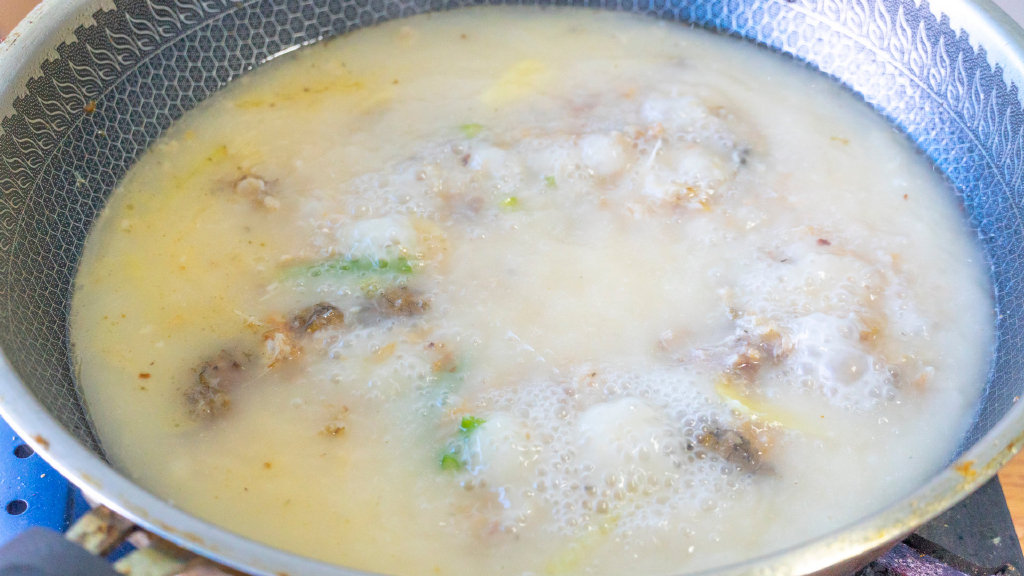 9、10分钟后我们来看一下,汤色果然奶白又鲜美,接着倒出来过滤掉下鱼肉和鱼渣。
