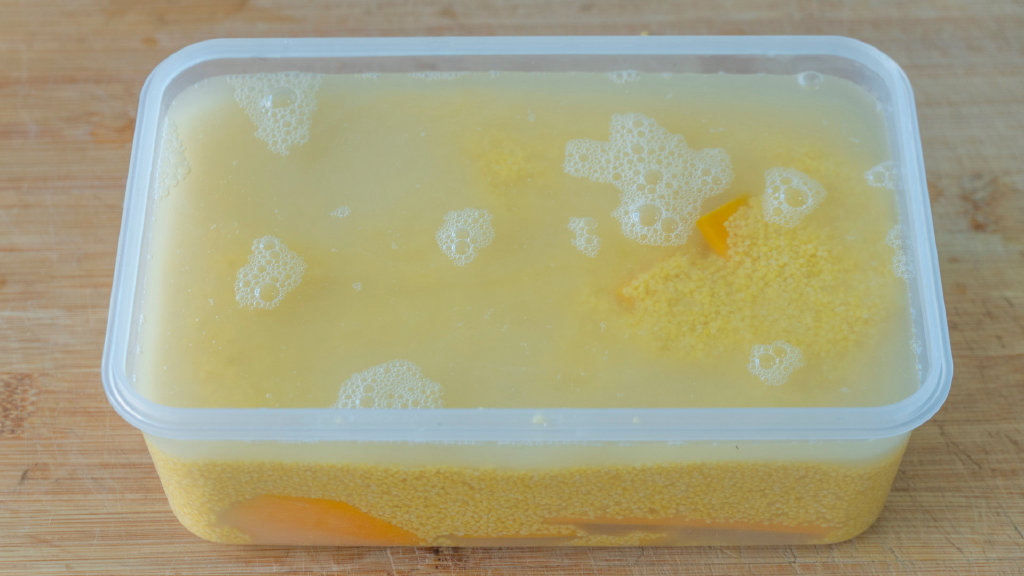 3、再把小米也倒进来,接着倒入适量清水,水量没过小米就行,再用保鲜膜盖起来扎孔透气。
