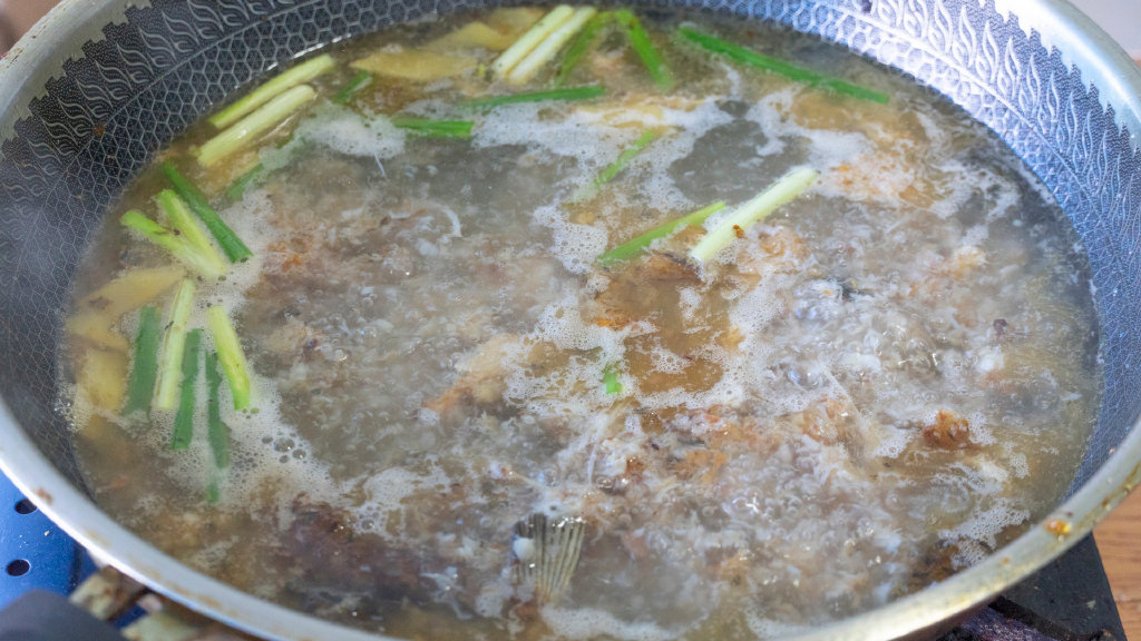 8、再加葱段、姜片、开水,盖上大火煮10分钟。想要鱼汤颜色乳白,这里一定要加开水哦,切记。