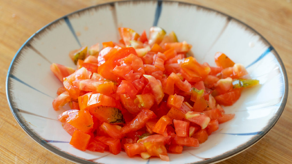 3、接着准备2个西红柿,洗干净后去蒂切成小丁,装入碗里备用。