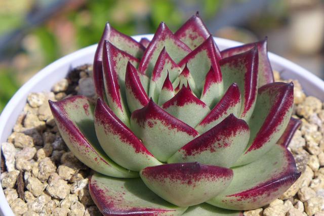 红宝石算是多肉中元老级的普货品种了,出状态的时候颜色红亮、光泽度非常强,就像闪闪发光的宝石,因此而得名。红宝石的株形相对紧凑,呈现规整的莲座型,没有状态的时候叶片会是翠绿色,叶尖带有一点红晕,只要不是过分徒长摊大饼,同样具有观赏价值。