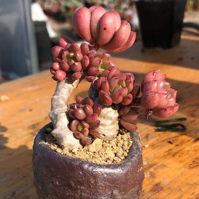 紫珍珠也被称为是纽伦堡珍珠、丁香,容易养成群生的大老桩,出状态的时候整个叶片都会变成紫粉色,尤其是叶心的颜色会更加鲜艳,是非常漂亮的一个普货品种,每年的春节之前,大盆的紫珍珠都会被当成是年宵花卉,销量非常好。