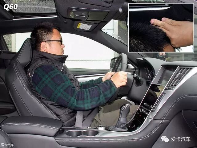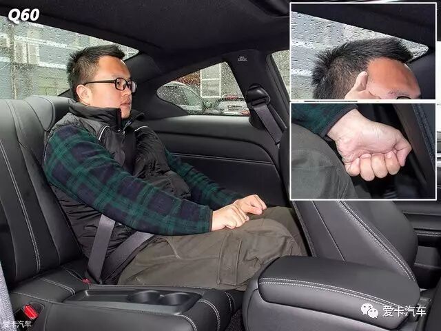 英菲尼迪Q60 :身高174cm的体验者坐进全新Q60的驾驶座,并将座椅调至最低后,头部有三指多一些的空间。来到后排,头部基本顶在后窗上,腿部能有近一拳的空间。