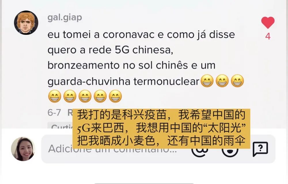 抖音视频《你讨厌中国,但是……》,视频由受访者提供。后期编辑:薛松(00:52)在巴西,一条名为《你讨厌中国,但是……》的tiktok视频得到了1000万的浏览量。视频里有一个长发大眼的中国女孩,她用一口流利的葡语说:“科兴疫苗是中国的,牛津疫苗的原材料是中国来的,你厨房的刀和擦丝的工具是中国来的,阿里巴巴已经向世界发了10年的货,巴西14个州的电能是通过中国企业国家电网传输的,如果你把上面我说的这些都从你的生活中拿掉,那你最好也别看这个视频了,因为tiktok也是中国来的。还有最好你也把你的手机扔掉,因为你的手机不管是什么牌子,零件都是中国产或组装的。巴西所有的电信运营商,用的都是中国企业华为的设备。如果你生活里用了至少一样中国的东西,就给我点个赞吧。”