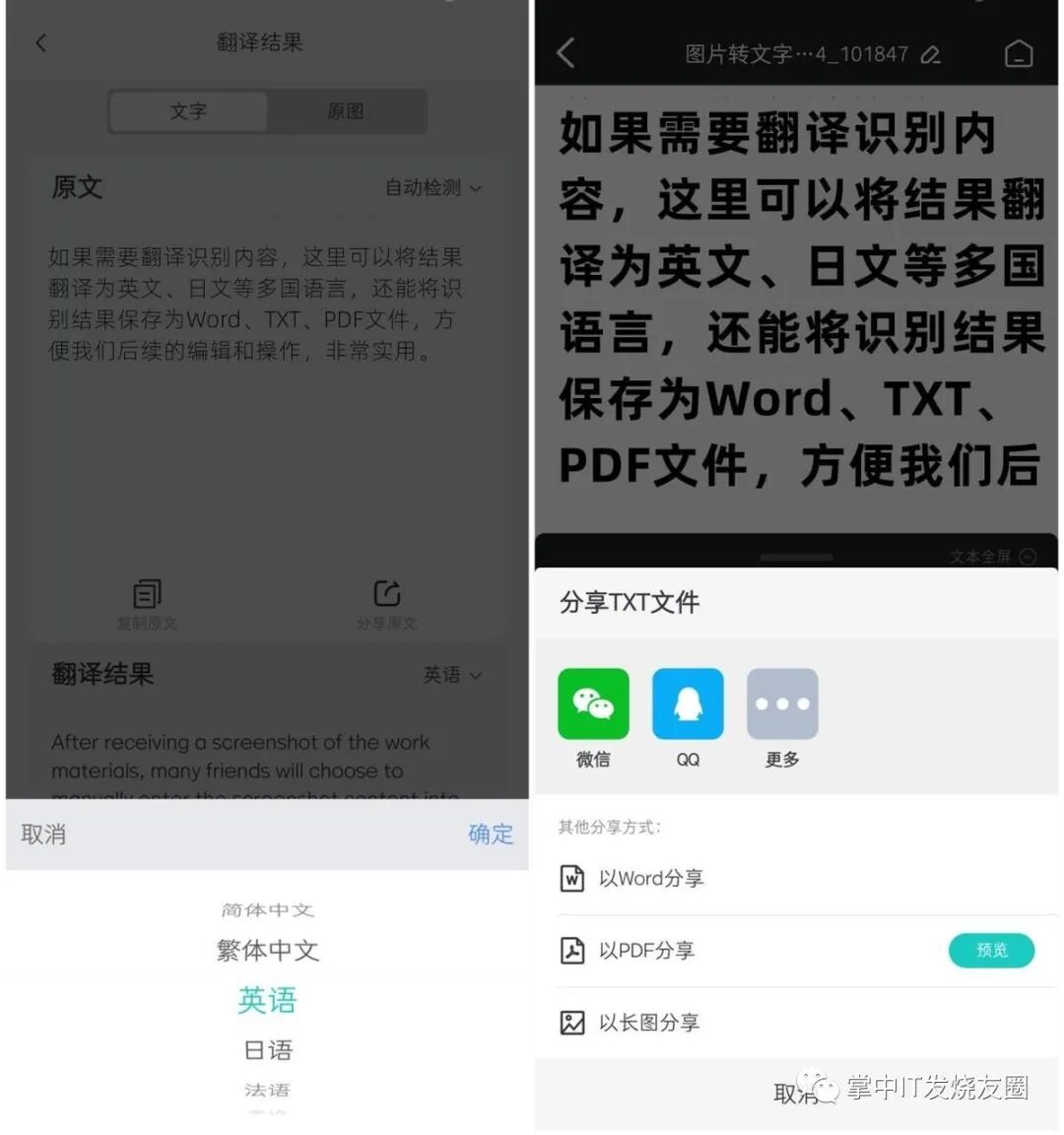 如果需要翻译识别内容,这里可以将结果翻译为英文、日文等多国语言,还能将识别结果保存为Word、TXT、PDF文件,方便我们后续的编辑和操作,非常实用。