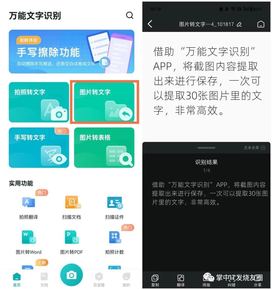 很多朋友截图是为了保存图片里的文字,其实我们可以借助“万能文字识别”APP,将截图内容提取出来进行保存,一次可以提取30张图片里的文字,非常高效。