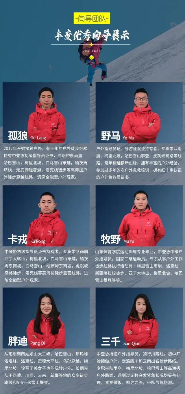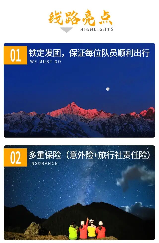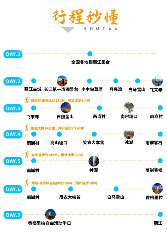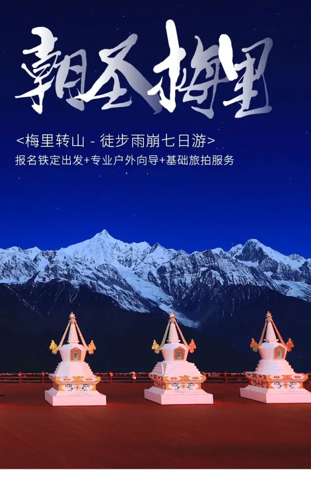云南最壮观的雪山山群 √ 特有的各种雪域奇观 √ 朝拜信仰之力 √ 众神庇护的世外桃源 √ 城市没有的悠然与自在 √ 梅里雪山它处于世界闻名“三江并流”地区,主峰海拔6740米,是至今人类未能征服的“处女峰”,是众山之神。它就是——梅里。 特殊的环境和气候,使梅里雪山常年云雾缭绕,即使冬季无雨的日子,当地居民都很少能见到她的真容。能看到梅里的日照金山,更是很多人一辈子的心愿。 这儿有着800多年的转山历史,是藏区人们心中的圣地。他们会以徒步行走的方式去朝拜山中的圣地,这是一种盛行于藏区的宗教活动,他们称之为“转山”。 梅里这条终年积雪的雪山群,绵延150多公里,海拔超过6000米的山峰多达13座。梅里雪山是雍仲苯教的圣地,在藏民心中有着很高的地位。是国内最为经典的户外徒步活动的地方。 我们遵从藏族信徒转山的走法,设计了梅里雪山雨崩徒步旅行活动,最大可能的再现“转山”这一独特而神秘的活动,并尽可能全方位的欣赏梅里雪山的冰川、峡谷、瀑布、原始森林美景。 报名详情 行程安排 D1:全国各地-丽江 D2:丽江-小中甸-月亮湾-飞来寺 D3:飞来寺-日照金山-西当-南争垭口-雨崩村 D4:雨崩村-沙棘林-笑农大本营-冰湖-原路返回 D5:雨崩村-原始森林-朝圣营地-神瀑-原路返回 D6:雨崩村-尼农峡谷-香格里拉 D7:香格里拉自由活动半日 - 丽江古城 活动团期、活动费用 单号集合 双号出发(报名前请先咨询是否有位置) 以下费用为全程费用,仅雨崩三晚住宿不同 雨崩村三晚普通住宿 1880元/人单房差400元 雨崩村三晚升级住宿2380元/人 单房差770元 活动报名 酒店参考: 丽江:金泉大酒店或同级 飞来寺:藏康缘酒店或同级 雨崩品质3晚:国际青旅或同级 雨崩升级3晚:听风客栈、山语或国际青旅3楼或同级 香格里拉:格林豪泰汽车站店或者同级 费用说明 费用包含 1.住宿:全程6晚标间住宿(丽江1晚、雨崩3晚、飞来寺、香格里拉市住宿各1晚);丽江住宿为赠送不用不退;升级套餐仅为雨崩村内三晚住宿升级,其他点住宿与品质住宿一致。 备注:雨崩村是需要徒步才能到达的原始村落,住宿条件落后,条件无法与大城市相比,请知悉! 2.交通:行程中6天旅行用车,一人一正坐(9、17、39座等,根据人数安排车型); 3.门票:梅里雪山套票(月亮湾、飞来寺观景台、雨崩村)、雨崩村管理费; 4.向导:1人即派向导随行,提供全程带队及基础拍照服务; 5.多重保险:旅游意外组合险50万/人,因道路交通事故造成的客人意外伤害,按《道路交通事故处理方法》由保险公司赔偿,俱乐部不承担另外的赔偿责任; 赠送福利 不用不退 奖项:证书1份,纪念奖牌1枚; 装备:登山杖1根、矿泉水1瓶、一次性雨衣1件、魔术头巾1条 接机/接站服务:3人及以上同时报名同一航班,赠送丽江接机/接站至集合酒店一次; 费用不含 1. 大交通:各地到丽江往返大交通; 2. 单房差:品质团、雨崩升级住宿不收自然单房差;升级住宿出现单男单女优先安排雨崩村里与同性拼房; 2. 餐饮:全程用餐自理,驴友可一起AA,向导会根据需求给予推荐(人均每餐40元左右); 3. 骡马/乘车费用: 雨崩徒步过程中,个人自行骑马费、乘汽车、摩托车等(费用景区均有公示,服务不属于俱乐部提供,安全及服务问题请驴友自理); 4. 其他:一切个人消费及费用包含中未提及的任何费用。 退订政策 1、使用日期前10天17:00之前(含)损失费0%; 2、使用日期前7天17:00之前(含)损失费30%; 3、使用日期前3天17:00之前(含)损失费60%; 4、使用日期前3天17:00之后(含)损失费80%; 5、行程开始后,因个人原因需提前退团,需签署离团协议,并不退任何费用,敬请理解。 它安详从容,仿佛亘古以来的心灵归所和力量源泉。或许只有真正看过一次,才会被它的场面恢弘壮观,震撼人心。 活动具体行程 D1:全国各地-丽江 从全国各地自行前往丽江集合,可游览丽江古城,感受这座高原城市独特的浪漫,晚上入住我们安排的酒店。 D2:丽江 - 小中甸 - 月亮湾 - 飞来寺 行程:约360KM,全天预计8个小时车程。 清晨我们将出发前往飞来寺,而后经过风吹草地见牛羊的【小中甸】,感受不一样的香格里拉草原风光,而后继续前行到达奔子栏享受午餐。而后途经【月亮湾】,那一刻我们将会体会到所有幻想家的梦想。 然后继续往前行驶,傍晚来临之际我们将到达酒店,傍晚可到飞来寺观景台观看梅里雪山,近距离感受这座神圣的雪山。天气较好的时候可一睹梅里雪山的绚烂晚霞,当整个霞光铺满雪山的上空,那一刻的震撼是此生都不会再见到的。 住宿:飞来寺酒店标间 D3:飞来寺 - 日照金山 - 西当 - 南争垭口 - 雨崩村 行程:徒步约11KM,预计6个小时。 根据当天日出时间,我们需要提前起床前往【梅里雪山观景台】欣赏一生难得一见的神奇梅里日照金山。刷一组逼格爆表的朋友圈后,将于8:00乘车前往【西当】,然后从西当开始我们就要徒步进入与世隔绝的雨崩村落了。 爬升海拔1000米到达【南争垭口】后一路下坡,在夜幕快要降临之前到达【雨崩村】,朴实却有特色的藏式小房子将会呈现在你眼前。 备注:如果小伙伴中体力弱较弱的可以选择从西当乘车进雨崩(西当到雨崩大约200元/人)若需乘车的客人,请一定注意安全,且费用、安全等问题由客人自行负责。 住宿:雨崩村标间 D4:雨崩村--笑农大本营-冰湖-原路返回 行程:徒步约14KM,预计7小时。 清晨8点,我们将从雨崩村出发,一路徒步到达冰湖