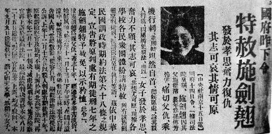 据载,刺杀得手后,施剑翘将《告国人书》和父亲相片抛洒向天,并立刻自首,而最终获得特赦,只被判处有期徒刑七年。后经冯玉祥等国民党元老游说,国民政府主席林森特批,在入狱11个月后,施剑翘重获自由,成为那个动荡年代最后的女侠缩影。
