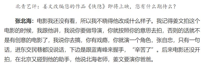 从早些时间北青艺评对张北海的采访中,我们可以注意到一句话,就是姜文的助手告诉他,姜文要演他爸爸。