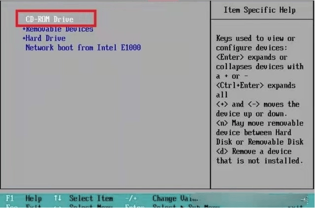 再次将第一个启动项改为CDROM按“”键,CD-ROM能移到第一个项目。