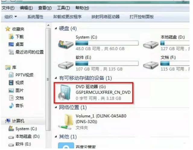 先准备一个4.7GDVD空白光盘,然后刻录光盘系统软件win7(ios您的光盘格式。最后,我们将在电脑光驱中刻录更好的光盘系统光盘。打开它。你可以在“电脑”中看到系统光盘。