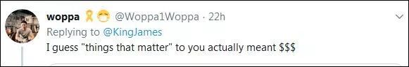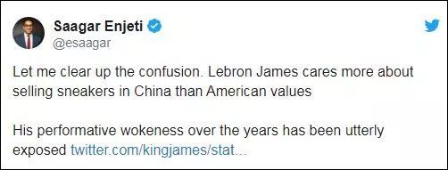 与之前球员的遭遇类似,詹姆斯也被国外社交媒体上不少人批评“懦夫”,“只是为了钱”。不过《湖人日报》称,大多数的批评都来自于网络,他们不管詹姆斯做什么都想要去恨他。可在这场舆论风暴中,最引人注目的是来自看似公正的消息源的批评。“国会山”新闻驻华盛顿首席记者兼主持人Saagar Enjeti模仿詹姆斯的语气说:“让我澄清疑惑。詹姆斯更关心在中国卖运动鞋,而不是美国价值观。他多年来的表演才艺已完全显露出来。”