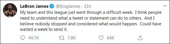 “我的团队和本联盟刚刚经历了艰难的一周。我认为人们需要懂得,一条推文或者一个声明会对他人造成何种影响。我认为没有人会停一下思考接下来会发生什么事情。本来可以等一周再发推。”