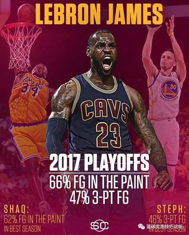 将沙奎尔·奥尼尔的禁区得分加上斯蒂芬·库里的投射能力,就是今年季后赛的勒布朗·詹姆斯。奥尼尔单赛季内线命中率最高为62%,库里单赛季三分命中率最高为46%,而今年季后赛詹姆斯这两项数据分别是66%和47%。