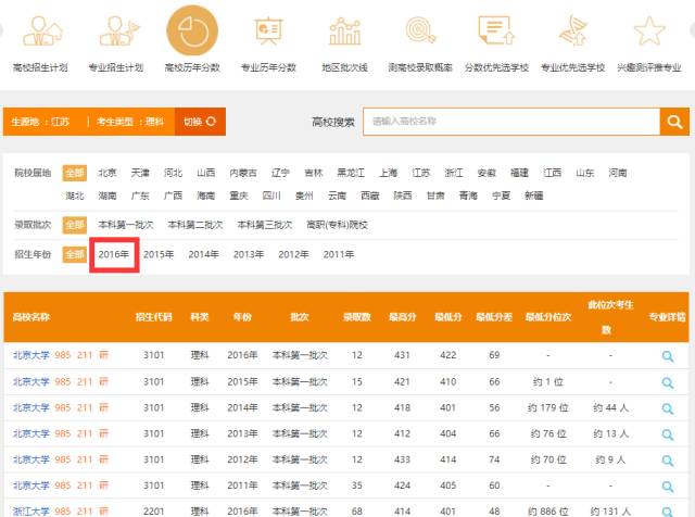 (1)志愿通系统上线了2016年最新的高校和专业录取数据,考生和家长们可以更方便直观的查询历年分数和比较院校及专业情况了!