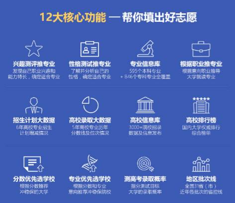 志愿通智能系统汇聚了12大核心功能,从兴趣测评到专业选择,从专业介绍到职业匹配、从高校计划到录取分数等,志愿通做到了全方面的覆盖。