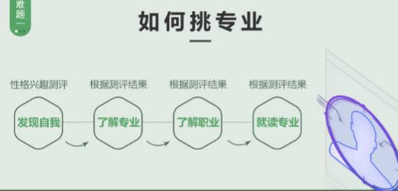 从测评发现考生的兴趣点 ☛ 根据兴趣点确定适合的专业 ☛ 了解该专业未来可做的职业 ☛ 就读该专业
