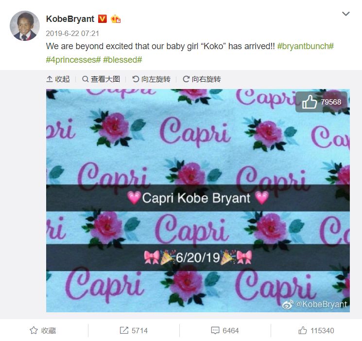 尽管粉丝有点稍稍失望,但作为老爹的科比却很高兴,在微博上分享了这一好消息。