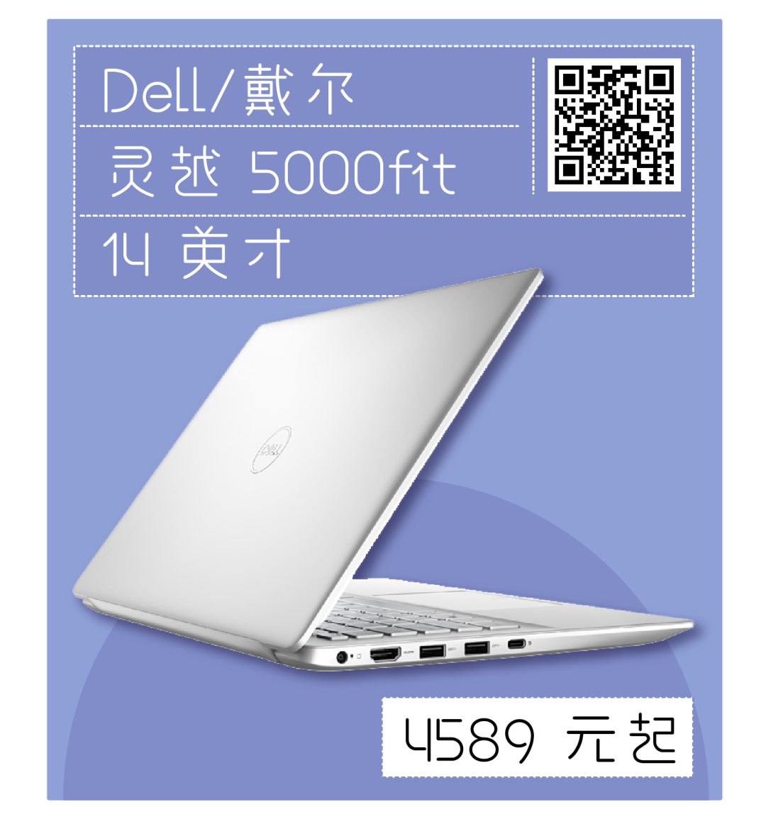 这几款电脑价格从 4000 多到上万元不等,配置均为十代 i5 处理器、8G 内存起步,搭配的 SSD 硬盘数据读取速度快、用起来也更稳定。这个配置日常工作娱乐够用,偶尔用用 PS、剪下视频、玩玩游戏也没问题。 戴尔灵越系列的外观设计走的是中规中矩那一路,正面简约朴实,居中的 Logo 没有太多强调设计感。可能是为了跟这个外形中和一下下,颜色上有银、绿、紫三种颜色, 还是蛮小清新的。 它的屏幕分辨率是 1920*1080,清晰度、色彩表现还算可以,日常用不会有太大问题。 它的屏幕打开之后,会把键盘支撑起一个角度,打字更舒服不说,对电脑的散热也会更好。它的外接接口也非常丰富,除了常见的 USB、耳机和外接显示器、投影的 HDMI 之外,还有一个全功能的 Type-C 接口和一个 SD 卡插槽。 Type-C 接口能够支持高速数据传输,充电、传输文件都更快,也能支持外接 4K 显示器。SD 卡插槽对摄影爱好者来说是相当友好了。 灵越 5000fit i5 处理器+8G 内存+512G SSD 硬盘,售价 4589 元,支持两年整机联保,在 2100 多个城区可以上门维修。 🔗