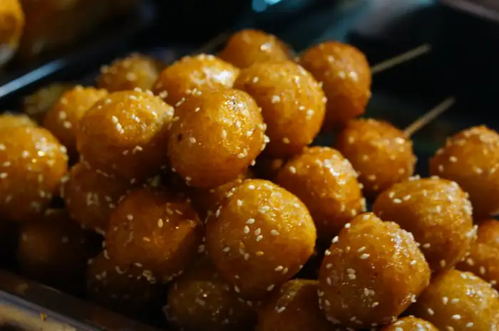 糖油果子是伴随成都人长大的小时候的味道,色泽黄亮,外酥内糯,香甜可口。糖油果子以糯米、红糖和芝麻为原料,将糯米粉团在油中炸制后裹上白芝麻并用竹签穿起来,炸的好的果子里面是空心的,表皮酥脆洒满了白芝麻,咬下去皮脆内软。非常值得推荐!