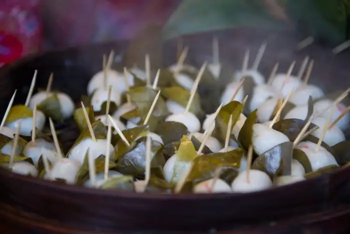 推荐理由:叶儿粑又叫艾馍,原是川西农家清明节的传统食品。1940年,新都天斋小食店将艾馍精心改制,更名为叶儿粑。到了四川,只要是有小吃,肯定有它。制作叶儿粑选料考究,工艺精细,具有色绿形美、细软爽口的特点。用糯米粉面包麻茸甜馅心或鲜肉咸馅心,外裹鲜橘子叶,置旺火蒸。特色是清香滋润,醇甜爽口,荷香味浓,菜分两味,咸鲜味美。