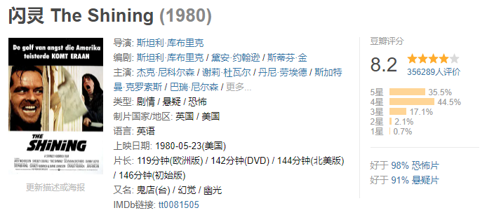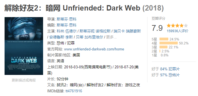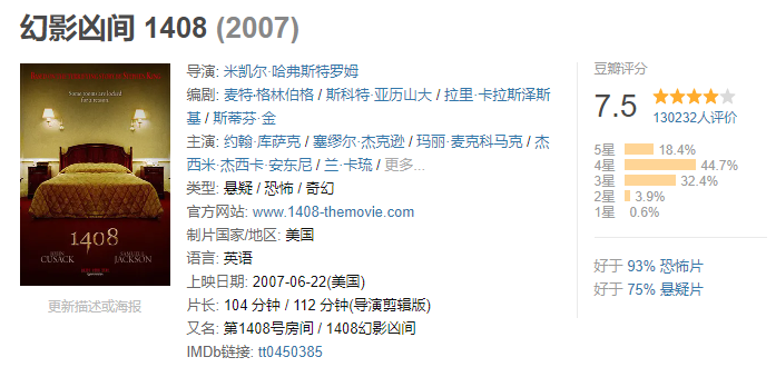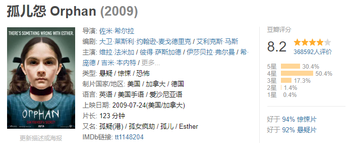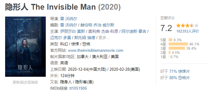 如果说到看什么类型的电影最浪费票钱 那一定是恐怖片了 遇上特别高能的 整部恐怖片可能只看了10% 其他90%的时间是在看前排的座位 以至于电影剧情没记住 电影院座位总共有几个却一清二楚 下面就来盘点几部全程高能的恐怖片 大家可以拉上勇敢的小伙伴 躲在他们身后用余光扫射…… 解除好友2:暗网 余光扫射指数:⭐⭐⭐ 主演: 科林·伍德尔 / 斯蒂芬妮·诺格拉斯 马迪亚斯在一家咖啡店里捡到了一台笔记本电脑,他将电脑带回了家,通过,通过这台电脑和好友莎伦娜、达蒙、娜丽等人联机视频,随着时间的推移,他们渐渐发现了隐藏在这台电脑里的可怕的秘密。 由于使用了第二人称的独特视角讲述,很容易让人沉浸进去。 隐形人 余光扫射指数:⭐⭐⭐⭐ 主演: 伊丽莎白·莫斯 / 奥利弗·杰森-科恩 可以说是今年的恐怖片爆款了。 西西莉亚的男朋友阿德里安是个光学领军人物,同时也是个控制欲极强的人。就在西西莉亚冒死逃出来的时候,阿德里安被宣布自杀了。但西西莉亚始终觉得有一个无形的影子在跟着自己…… 这部电影最恐怖的是你不知道某个地方是否有东西在看着你。 招魂 余光扫射指数:⭐⭐⭐⭐ 主演: 维拉·法米加 / 帕特里克·威尔森 罗杰与卡罗琳夫妇带着他们五个可爱美丽的女儿,搬到了位于罗德岛哈瑞斯维尔的一幢旧宅居住。好景不长,接二连三的怪异事件相继出现,令女孩们惊声尖叫,也让佩隆夫妇的神经绷到极点。 温子仁的经典作品,最恐怖的在于这部电影改编自真实事件! 关灯后 余光扫射指数:⭐⭐⭐⭐ 主演: 泰莉莎·帕尔墨 / 加布里埃尔·贝特曼 瑞贝卡早早离开了母亲索菲,独自生活,之后索菲和保罗结婚,生下了弟弟马丁。然而,保罗在一场事故中死于非命,索菲因此陷入了绝望之中,与此同时,马丁发现,妈妈常常会对着黑暗窃窃私语,似乎那里隐藏着一位“不速之客”。 不得不说,这部电影的音效和画面真的蛮吓人的! 幻影凶间1408 余光扫射指数:⭐⭐⭐⭐ 主演: 约翰·库萨克 / 塞缪尔·杰克逊 恐怖小说家麦克喜欢带着科学设备到闹鬼的地方探险。这次他选择了海豚酒店,不顾酒店经理的强烈劝阻,住进了1408号房间。起初他不以为然,当他终于承受不住一波一波的恐怖攻击,准备离开1408号房间时,最恐怖的事情发生了:他用尽办法也无法离开。 这部电影有好几种结局,还是挺值得回味的! 咒怨 余光扫射指数:⭐⭐⭐⭐⭐ 主演: 奥菜惠 / 伊东美咲 说到恐怖片就不得不提这部,恐怕是许多人的阴影。 咒怨最恐怖的点在于太过生活化,很容易让人产生代入感。 心理承受能力不足的建议不看,想看的话也请叫上一堆人一起壮胆。 闪灵 余光扫射指数:⭐⭐⭐⭐⭐ 主演: 杰克·尼科尔森 / 谢莉·杜瓦尔 也许是最经典的恐怖片了,40年了还一直被人津津乐道。 只能说斯蒂芬·金和库布里克太牛了,闪灵不仅气氛营造恐怖,在深入剧情,各个角色完整展现在你面前后,还会让人感到深深的压抑。 孤儿怨 余光扫射指数:⭐⭐⭐⭐⭐ 主演: 维拉·法米加 / 彼得·萨斯加德 / 伊莎贝拉·弗尔曼 约翰和凯特希望收养一个孩子。在孤儿院,他们见到了有些特立独行的小女孩伊斯特。小女孩所散发出的独特气质吸引了约翰夫妇,最终伊斯特成为他们家庭中的一员。 然而,随着伊斯特的到来,各种离奇事件接踵而至。凯特隐约感到,这个长着天使面容的小女孩背后有着不为人知的一面…… 看完这部后,许多人再也不敢直视萝莉了……