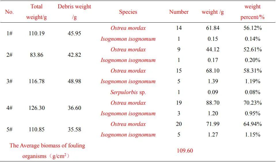 试验站人工建造的海水池改变了天然海域的生态环境条件,实验池内海水中的叶绿素 a 及硝酸盐浓度远低于周 边自然海域,导致池内的污损生物群落呈现种类少、密度低、个体小结构特点,与自然热带海域污损生物群落生物 多样性高、生物量大、生物生长迅速的特点迥然不同,这将直接影响对材料进行防污性能及腐蚀过程的准确检测和 评价结果。致谢:感谢中科院海洋所分类室刘会莲、王海燕研究员在污损生物鉴定中的帮助。
