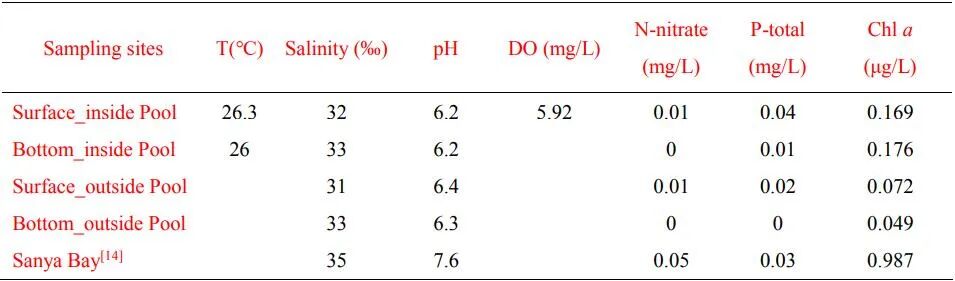 参照 GB12763.6-2007,于 2017 年 3 月检测了三亚站海水池内外海水水质(表 1)。结果表明,池内水质与池 外周边的相近,但与 1998 年三亚湾调查[18]的硝酸盐浓度、叶绿素 a 浓度含量相差较大。硝酸盐是生物重要的营养 盐,叶绿素 a 是体现浮游植物生物量的重要指标,试验池的海水硝酸盐含量仅是三亚湾海水年均量的 1/5,叶绿素 a 的含量是三亚湾海水的 1/6,表明池内海水的营养盐即海洋初级生产力均明显低于三亚湾海水。表 1 试验池内水质参数