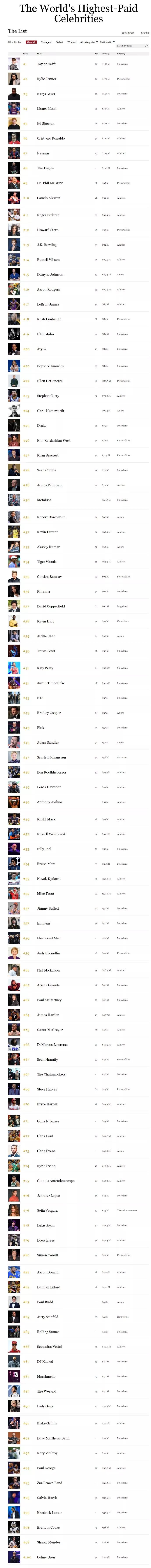 《福布斯》公布2019年全球明星收入排行榜前100名,歌手泰勒-斯威夫特以1.86亿美金排在总榜第一,凯莉-詹娜以1.7亿美金排在第二,侃爷以1.5亿美金排名第三。詹姆斯以8900万美金收入排在篮球明星第一,总榜第17位。中国明星,成龙以5800万美金排名39位。NBA明星还有库里、杜兰特、威少、哈登、保罗、欧文、字母哥、利拉德、格里芬、保罗-乔治上榜。