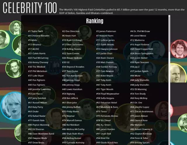 美国著名女歌手泰勒-斯威夫特以1.7亿美元的年收入排名第1位,足球巨星C罗(8800万美元)和梅西(8150万美元)分别排在第4位和第8位,他们也是这份榜单上仅有的两位排在勒布朗-詹姆斯之前的运动员。