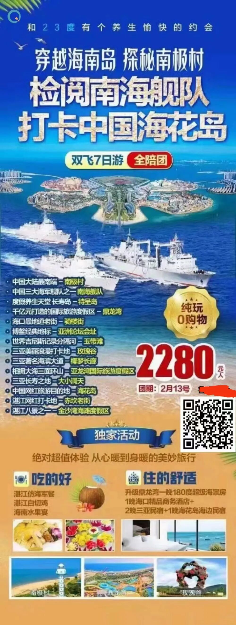 1、行程中自费必消套餐: +《南海舰队登陆军舰+海军餐+海军服+登舰证书》+升级海景房=598元/人