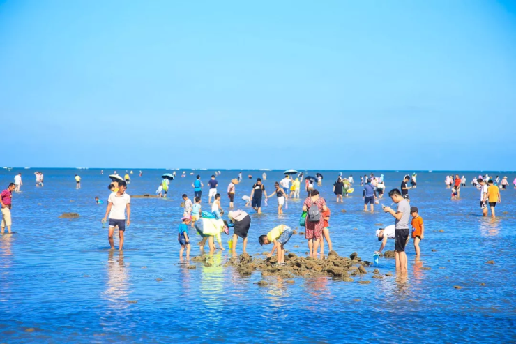 后观赏到中国绝无仅有的景观——【合水线】合水线,顾名思义,两个大海的交汇处。面朝大海,左边是南海,右边是北部湾。由于不同的洋流、潮汐作用,两个海域的海水不断拍打交织冲击处一堆泥沙。在退潮时,一条黄色的沙坝展露无遗。蜿蜿蜒蜒像一只牛角伸向海的中央。光着脚丫子踩在沙坝上,一脚凉、一脚暖是不是很神奇。因为北部湾的水温常年控制在18°左右,比起南海的水温略微清凉,才造就了这样奇特的体验。