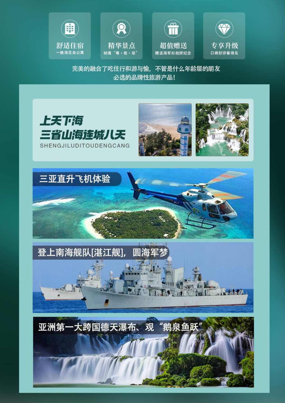 【设计理念】完美的融合了吃住行和游与愉,不管是什么年龄层的朋友,必选的品牌性旅游产品!
