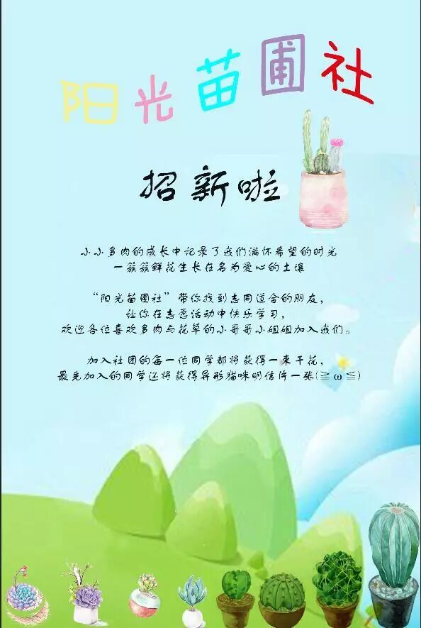 明天阳光苗圃 社团招新 阳光苗圃社是一家公益性社团 上一年度获评四星级社团, 可以说是非常的优秀了 主要是帮苗圃老师打理学校苗圃, 悄咪咪说一句话, 老师超帅 我们在南院还有一块地, 开发以后可以供社员种花 没有面试环节, 不收取任何会费 周四周五 我们在南院荟华广场招新, 报名加入的成员可以获得,干花小礼物 ,异形明信片, 先到先得 无论是风里,还是在雨里,我都在这里守候着你~ 欢迎所有喜欢花花草草, 喜欢公益的小哥哥, 小姐姐的加入 长按识别二维码