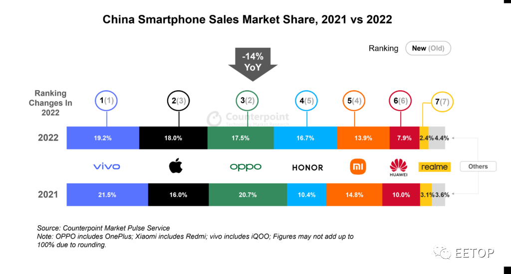 干货分享(2022年中国智能手机销量排行:华为占比下滑到个位数、荣耀逆袭超越小米、苹果赢麻排第二!)