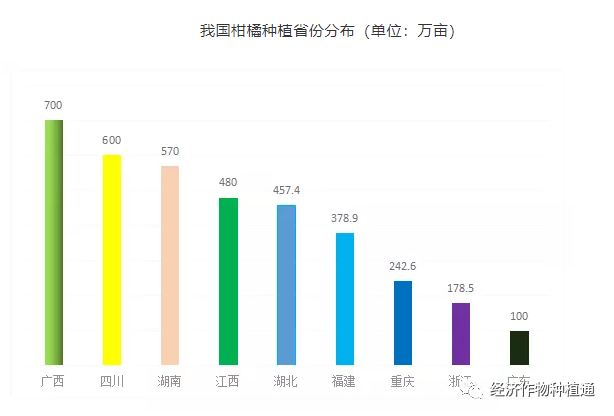 柑橘种植面积3730万亩(2018年国家统计局数据),产量4584.54万亩。主要分布在广西、四川、湖南、江西、湖北、福建、重庆、浙江、广东等地区。其中,广西柑橘面积700万亩,四川600万亩,湖南570万亩,江西480万亩,湖北457.4万亩,福建378.9万亩,重庆242.6万亩,浙江178.5万亩,广东100万亩。