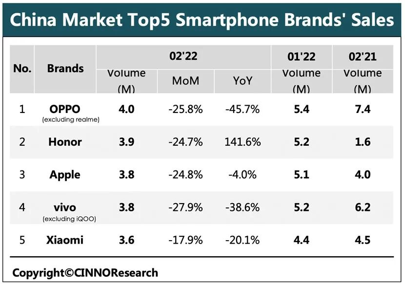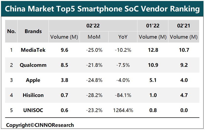 最近,市场调研机构 CINNO Research 发布了最新的 2022 年 2 月中国智能手机销量数据报告。根据这份报告,首先在市场总体方面,2 月中国市场智能手机销量约 2348 万部,同比下滑了 20.5%,环比下滑 24.0% 。从品牌份额来看,国内智能手机销量排行榜前五名依次是 OPPO、荣耀、苹果、vivo 和小米。对比 2021 年 1 月的数据,可以发现这五大品牌的手机销量基本都有明显下滑,特别是 OPPO 的销量同比下滑幅度达 45.7% 之多,即使如此,OPPO 也依然保持了排名第一的市场地位。2 月手机市场整体表现下滑的主要原因就是春节期间国内疫情反复,一定程度上给国内手机厂商复工复产带来了较多不利影响,从而影响了手机销量。在市场总体销量下滑的环境下,荣耀的手机销量甚至还实现了逆势增长,其销量较 2021 年 1 月大增 141.6%,荣耀也因此成为了其中唯一同比正向增长的品牌。这主要得益于新机型荣耀 60 和荣耀 X30,这两款手机在 2 月份取得了合计单月销量超百万台的好成绩,且荣耀 60 还取得了手机单品销售榜第四的位置,仅次于 iPhone 13、iPhone 13 Pro Max 与 iPhone 13 Pro。可见,苹果最新一代的 iPhone 13 系列在 2022 年 2 月的热度丝毫不减,2 月苹果手机销量排名第三,尽管环比下降了24.8%,但同比下降仅为 4.0%,是这五大手机品牌中同比下降值最少的手机品牌。值得注意的是,在 3 月份的苹果发布会中,iPhone 13/Pro 系列均推出了全新的绿配色版本,相信会给 iPhone 13 系列的热销带来新的推动力。vivo 与小米分列第四和第五名,vivo 旗下品牌 iQOO 逐渐承担起 vivo 打造高端的重任,而小米 12 系列上市以来表现平平,旗下仅两款红米机型进入手机单品销量前十。此外,CINNO Research 还发布了同期中国智能手机 SoC 芯片市场份额的报告,根据这份数据,联发科、高通、苹果、华为海思和紫光展锐分别位列前五名。市场整体方面,2 月中国智能手机 SoC 市场终端销量环比下降约 24%,同比下降约 20.5%,其中同比大幅下降主要来自华为海思。同时,中国智能手机 SoC 格局呈现出“两超一强”的局面,联发科与高通成为智能手机 SoC 的两大巨头,而苹果 A 系列芯片在品牌和产品的优势下席卷高端市场。从各品牌的数据来看,vivo 为联发科最大终端应用品牌,占比约为 30.6%;OPPO 为高通最大终端应用品牌,占比约为 24.2%;荣耀为紫光展锐最大终端应用品牌,占比约为 94.3%。随着苹果、高通和联发科相继推出了自家最新一代的旗舰芯片产品,2022 年的智能手机市场整体芯片格局已经基本成型,苹果 A15 仿生芯片默秒全,继续强势领先智能手机市场。由于众所周知的原因,华为海思麒麟 9000 下一代旗舰芯片发布遥遥无期,高通依靠骁龙8 Gen1 继续坚守安卓手机阵营旗舰宝座。压力来到联发科这一边,这一年联发科在产品布局上变得更加激进,首先推出了全球第一款采用台积电 4nm 工艺制造的天玑 9000 系列争夺高端旗舰手机市场,此后还推出了采用台积电 5nm 工艺的天玑 8000、天玑 8100 系列,以此来抢占中高端的市场。👇大家都在看👇