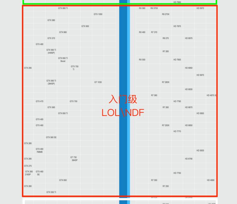 其实7代、8代英特尔CPU自带的核心显卡就能高画质很流畅的玩了,可是如果你的CPU比较老旧或者不带核显,或者想用2k分辨率玩LOL,下至GTX550TI、上至GTX1050,红框里的所有显卡都能满足你的需求。不过绝大部分都是老型号了,较新的只有GT1030 GTX1050 RX550 RX560。
