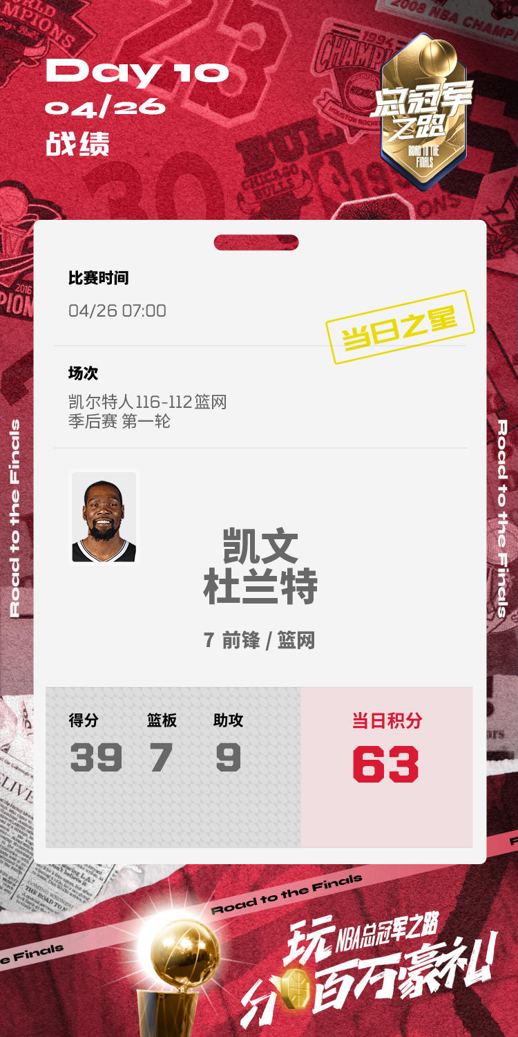 凯文-杜兰特在今天的比赛中得到39分7篮板9助攻,总得分63分,当选“NBA总冠军之路”当日之星。参与“NBA总冠军之路”,体验竞猜乐趣,瓜分百万豪礼。